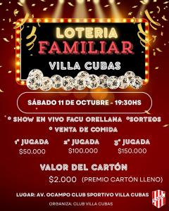 27/09/2025 | El Club Sportivo Villa Cubas invita a toda la comunidad a participar de la Gran Lotería Familiar, que se llevará a cabo el próximo sábado 11 de octubre a las 19:30 horas en las instalaciones del club, ubicado en Av. Enrique Ocampo al 800.